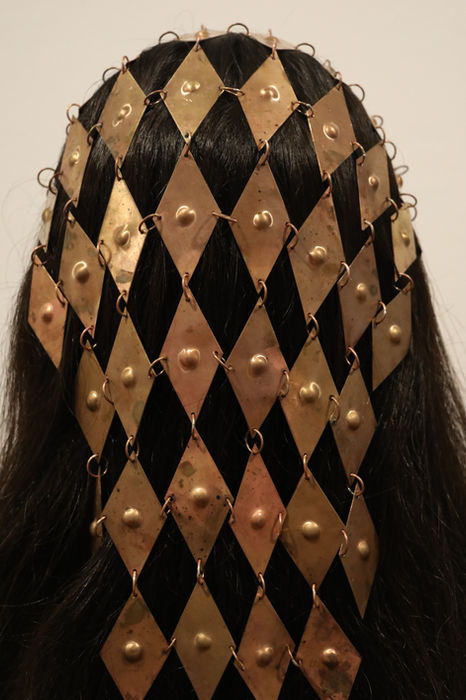 A head dress inspired by chain mail, made to make the wearer feel regal. Each piece (panels, rings, etc.) were cut, shaped, and soldered by hand.